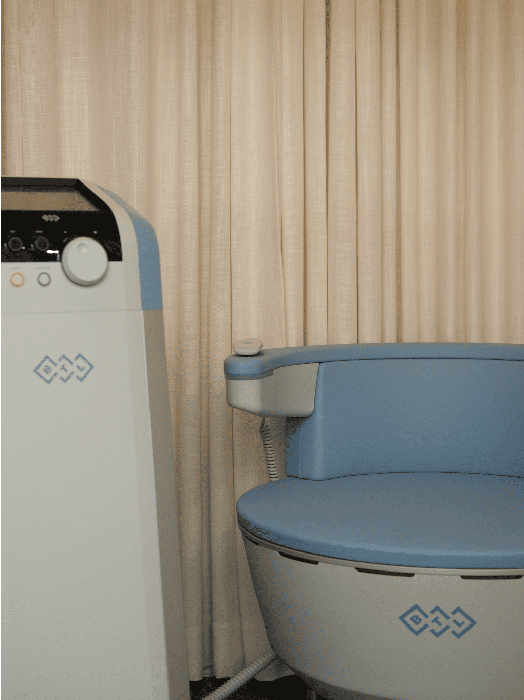 Du sitter fullt påkledd i stolen under hele behandlingen. Ingen inngrep. Ingen nedetid. Ingen kirurgi. Bare effektiv, skånsom behandling som gir bedre kontroll i hverdagen.